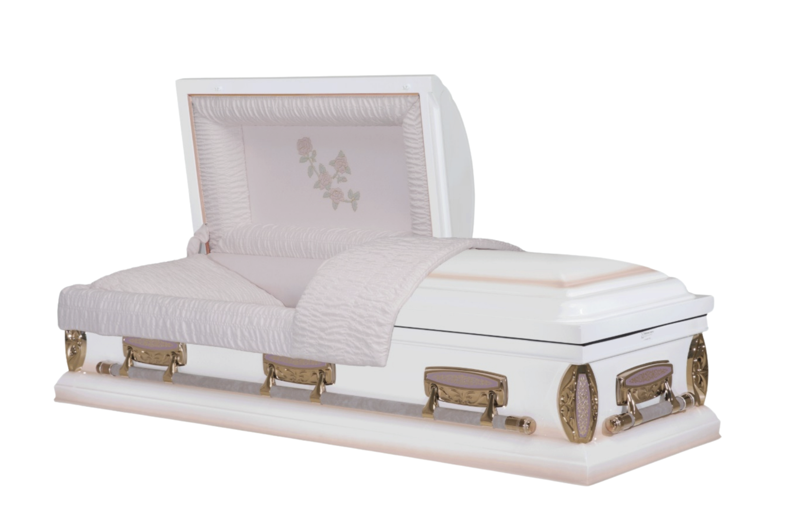 High Gloss Finish, Gasketed, Memorial Tube, Polished Gimp, Swing Bar Hardware, Trapunto Stitched Flowers in Head Panel. Interior: Pink Bellaire Crepe.